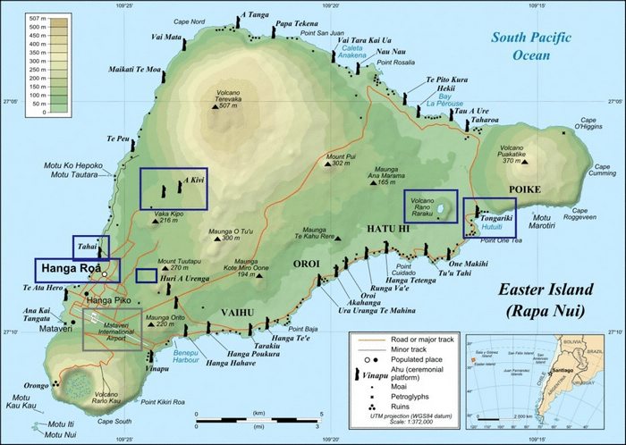 Easter Island is triangular in shape and small in size. This map will help you get an idea of what the island looks like, and what the most important attractions are! Boxes have been drawn on the map to indicate the places you will visit on your tour.