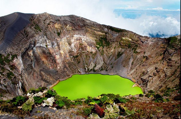 A popular day trip from San José to Poás Volcano (2,708 m) traverses the varied landscapes of the Central Valley, from flower fields and strawberry farms to cloud forests at higher altitudes. The road leads right to the lip of a caldera and a viewing platform offers a stunning look at the jade-colored lake at its depths, Laguna Caliente, which more recently is colored steamy white. The crater lake is quite acidic, with a pH close to 0. The interaction of rainfall with the highly sulfurous crater results in puffs of acid fog that can irritate the eyes and lungs.